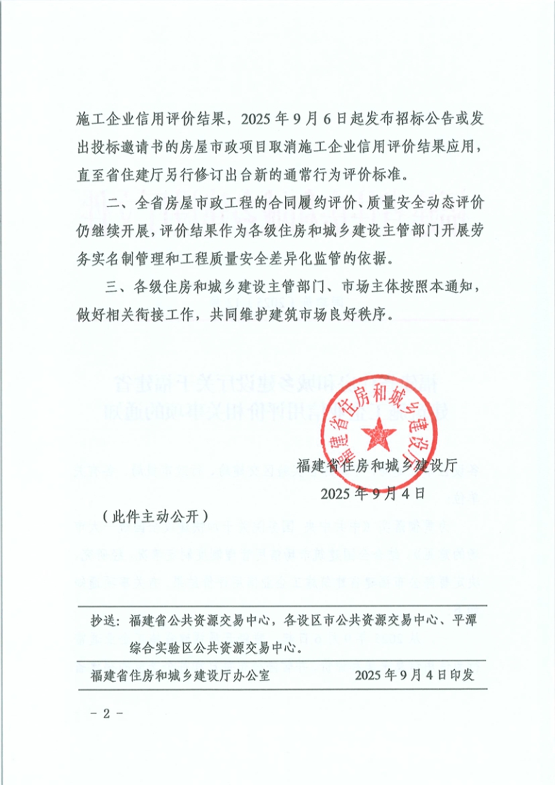 一、从2025年9月6日起,暂停开展福建省施工企业通常行为信用信息采集和评价,并暂停公布每日和每个季度的福建省施工企业信用评价结果,2025年9月6日起发布招标公告或发出投标邀请书的房屋市政项目取消施工企业信用评价结果应用,直至省住建厅另行修订出台新的通常行为评价标准。